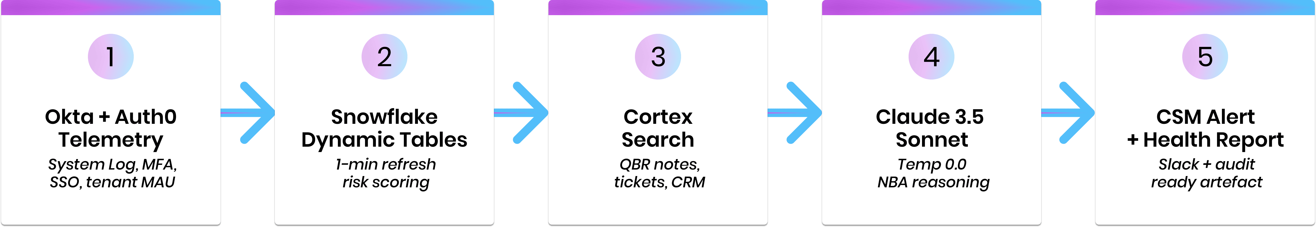 All five stages run inside the Snowflake account Okta already operates — no new infrastructure, no data egress, and CSMs get insights in the same Slack they already use.