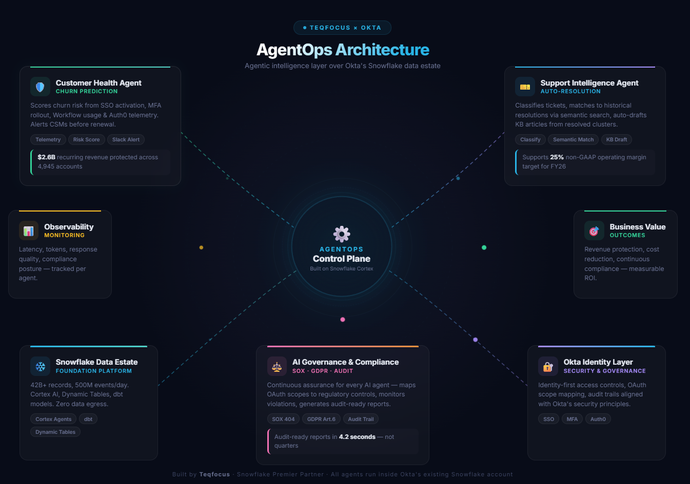Every enterprise deploying internal AI agents faces the same question from compliance: "How do we prove our agents aren't violating SOX or GDPR when they access data and act on behalf of users?" No vendor owns this category yet. Teqfocus built it — natively on Okta's existing Snowflake account, using Snowflake Dynamic Tables, Cortex Search, and Claude 3.5 Sonnet. No new infrastructure. No data egress. Audit-ready compliance reports in 4.2 seconds.